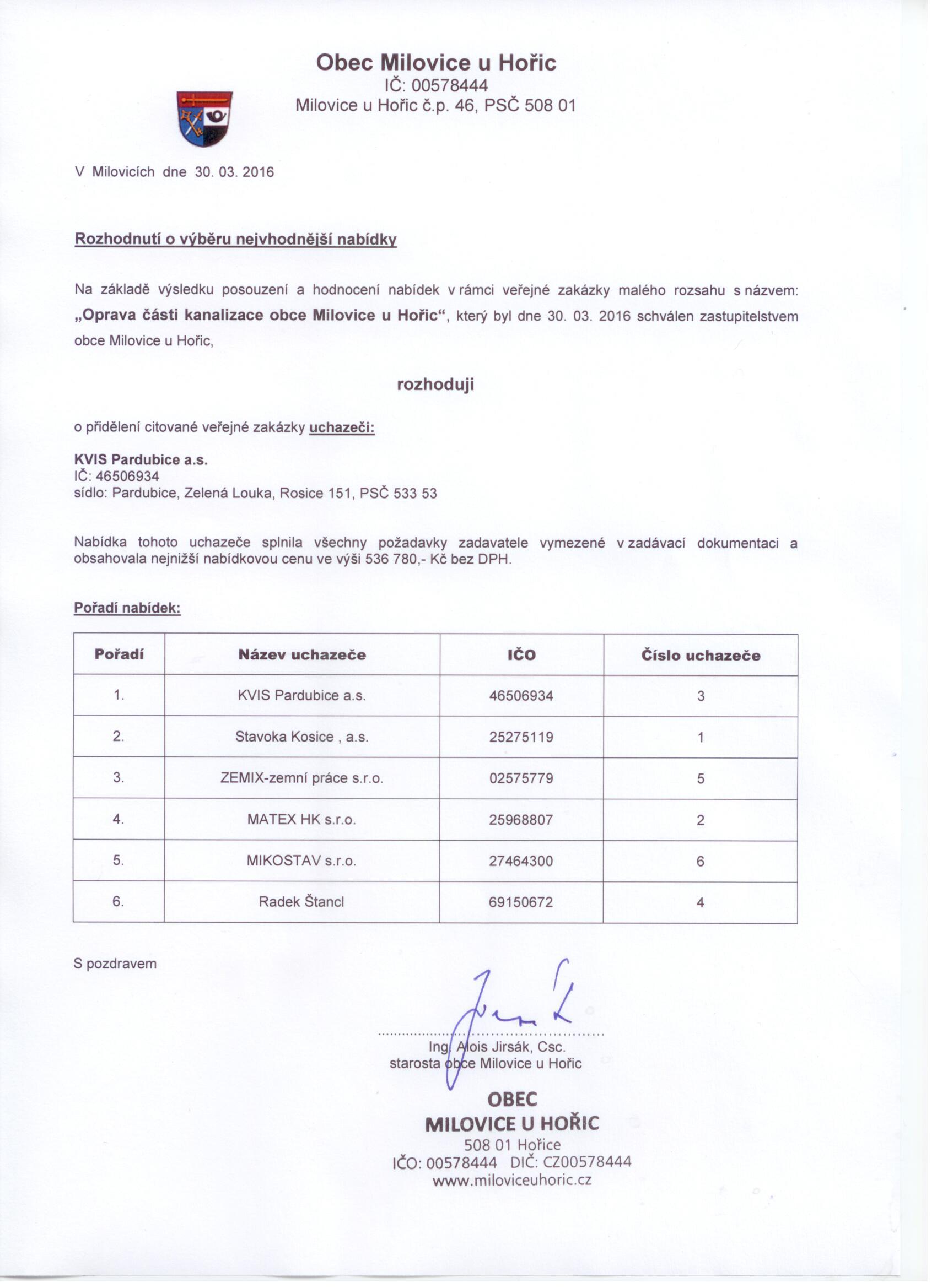 Rozhodnutí o výběru | ostatní dokumentace - veřejná |